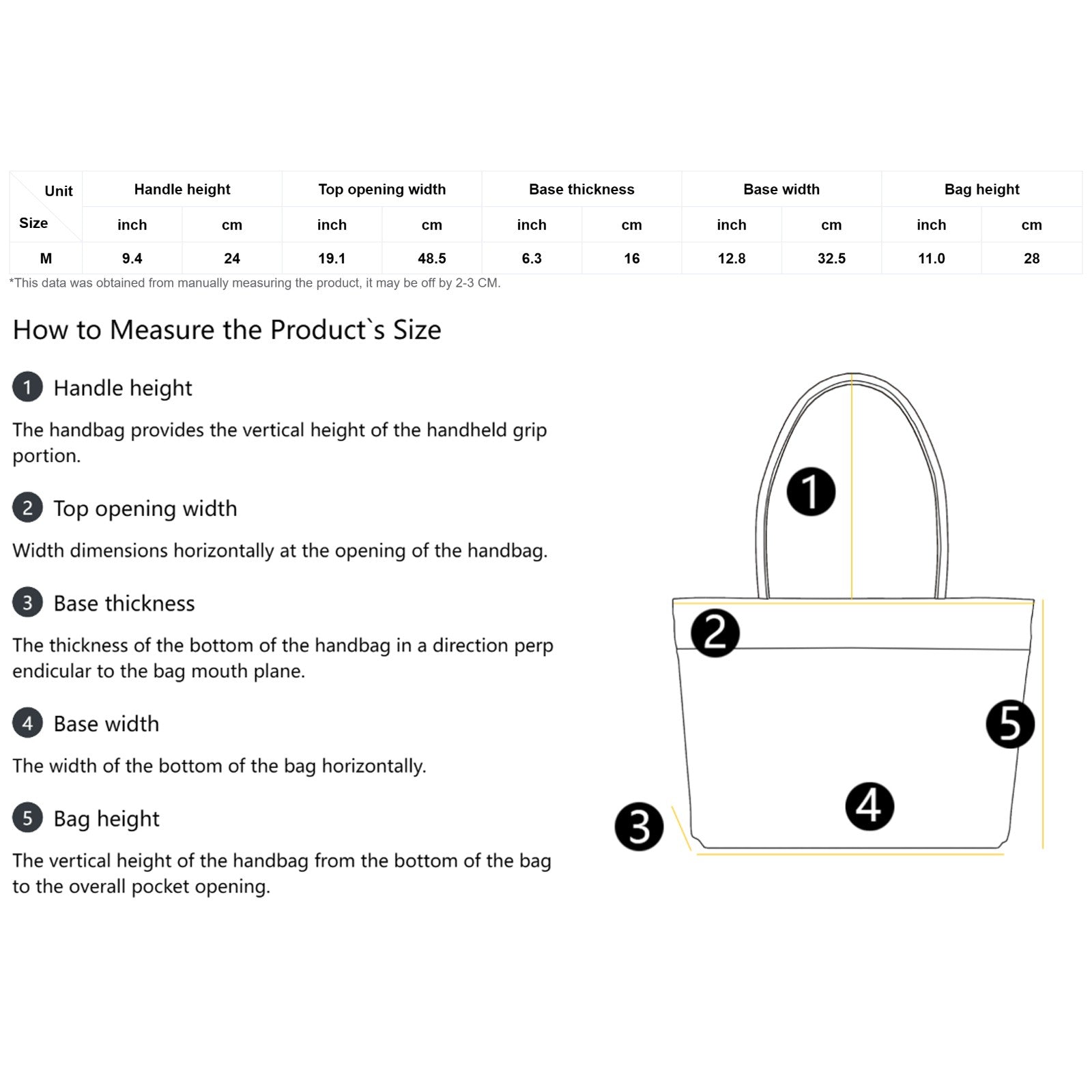 | Size | Handle height | Top opening width | Base thickness | Base width | Bag height |